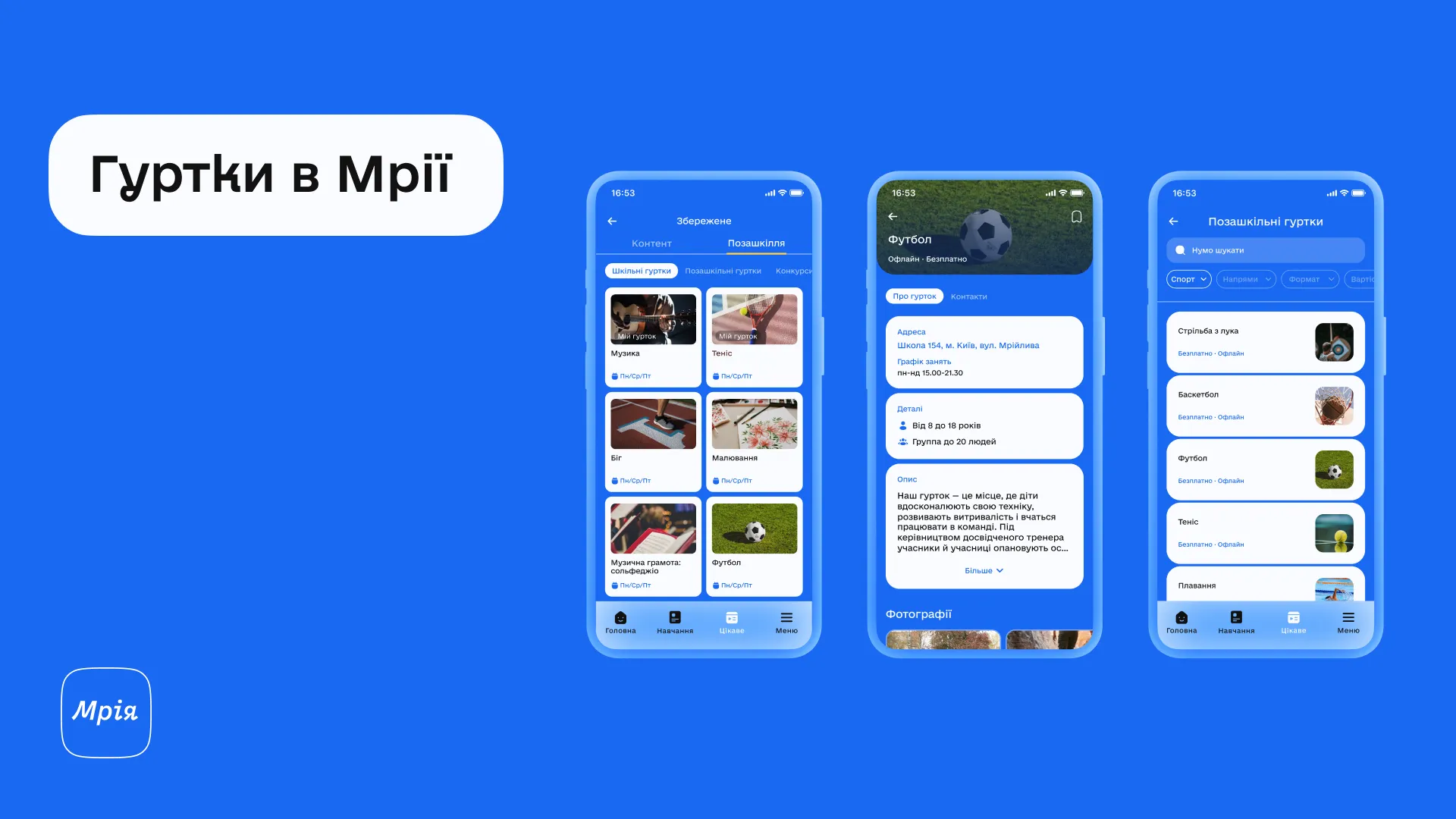 У застосунку можна буде шукати активності поблизу дому чи школи, переглядати розклад і зберігати вибране. З часом функціонал доповнять можливістю запису та відстеження занять прямо в Мрії.