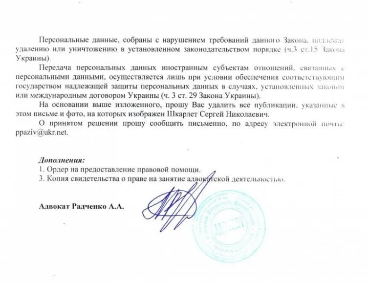 Причина вимоги – "публікації на сайті містять розголошення (поширення) персональних даних Шкарлета та фото, на яких він зображений".