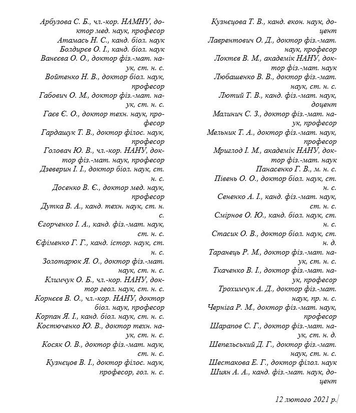 Заяву підписали доктори та кандидати наук, професори, академіки та члени-кореспонденти Національної академії наук та Національної академії медичних наук України – загалом 42 науковці.