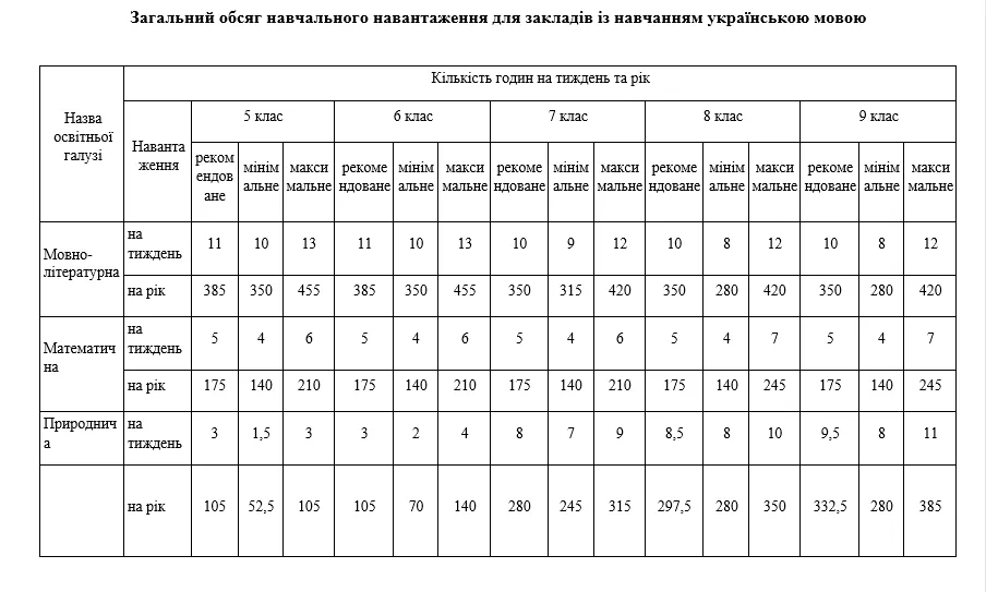 Обсяг навчального матеріалу з деяких предметів: приклад від МОН