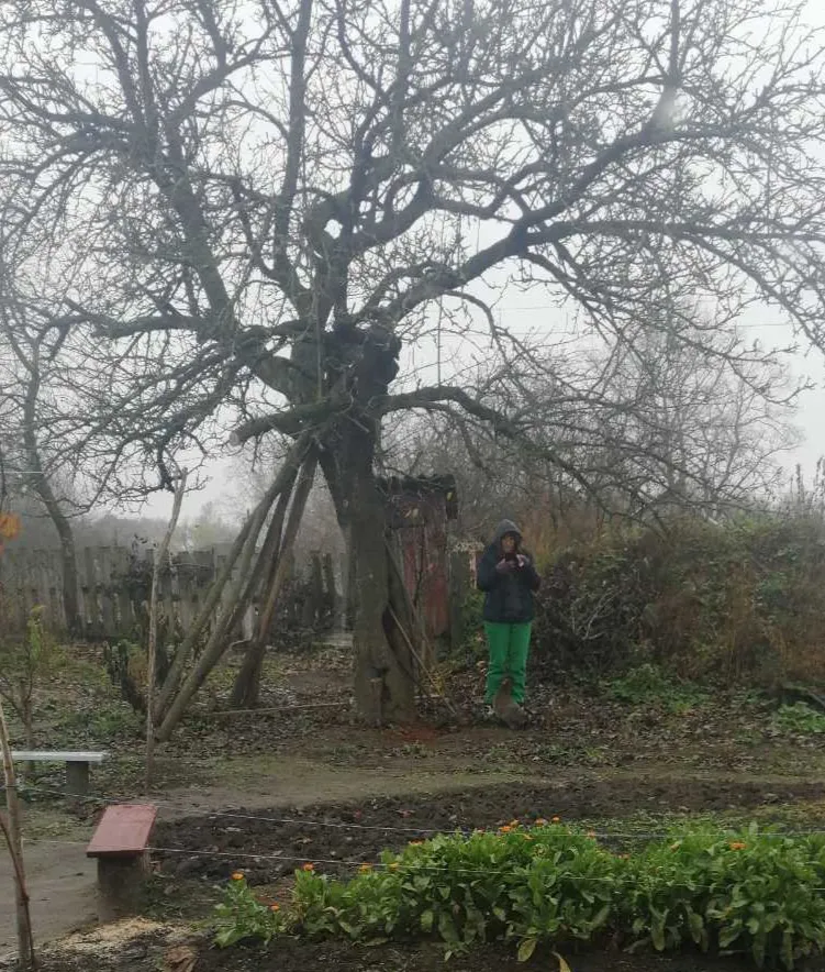 Вікторія – учителька біології з Миколаєва. Через війну переїхала до села На Чернігівщині. У час блекауту ловила мобільний інтернет, де тільки можна було, аби провести онлайн-урок. Найкращим сигнал був у садку під грушею. Восени тут занадто холодно, тому родина Вікторії побудувала для неї укриття. "Кабінет" назвали "Старлінком".