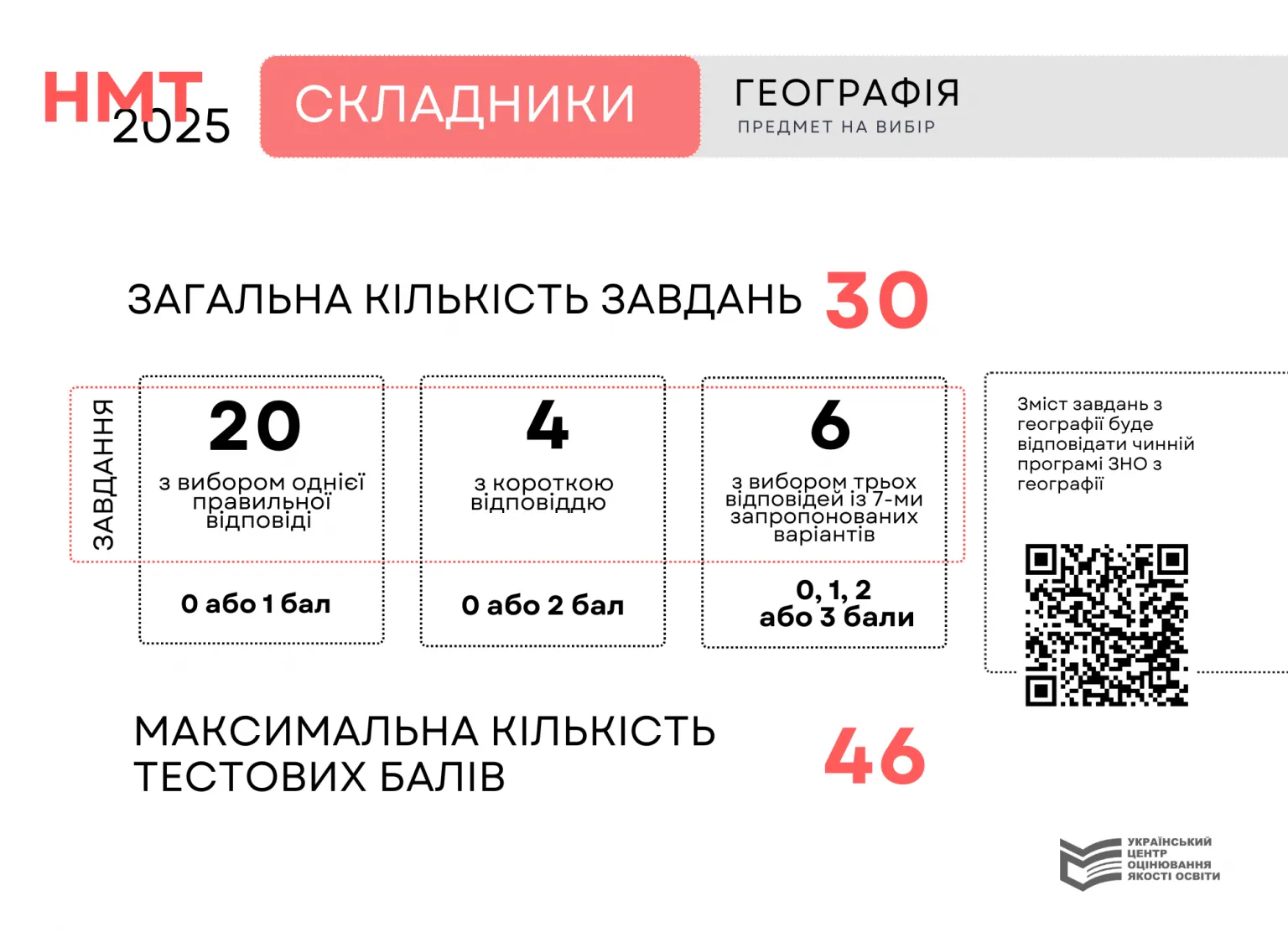 Зверніть увагу! За виконання завдань із географії можна буде отримати від 0 до 46 балів.
