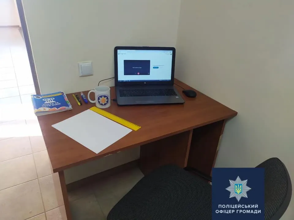 У відділку поліції для дівчинки заздалегідь облаштували робоче місце: поставили стіл, приготували канцелярське приладдя, під'єднали ноутбук до мережі, налаштували відповідні програми, які необхідні для онлайн-уроків.