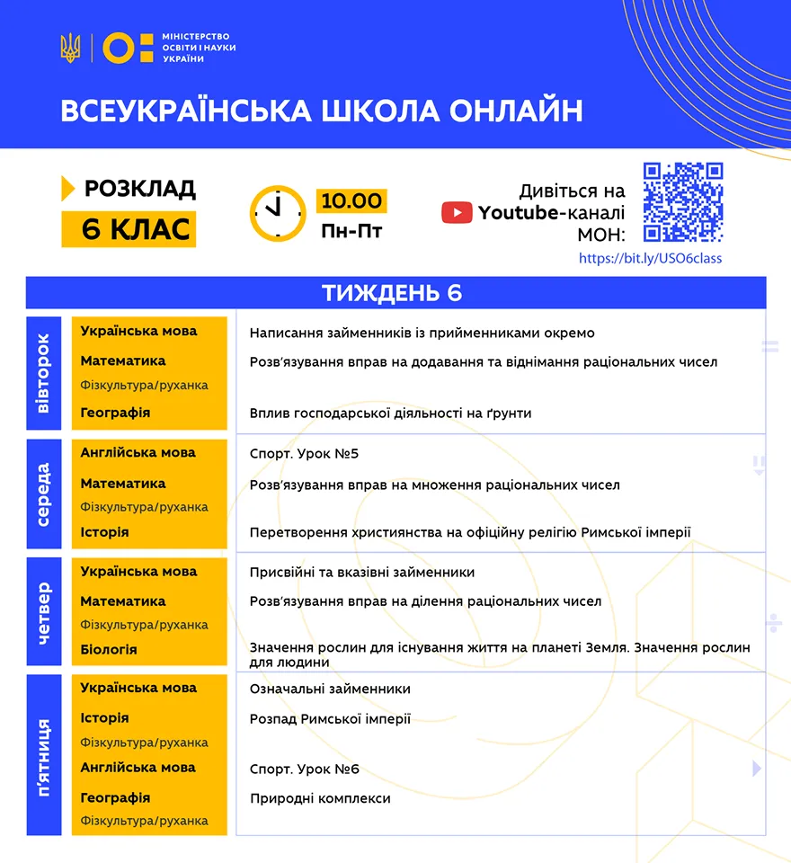 Розклад для 6 класу / інфографіка: МОН