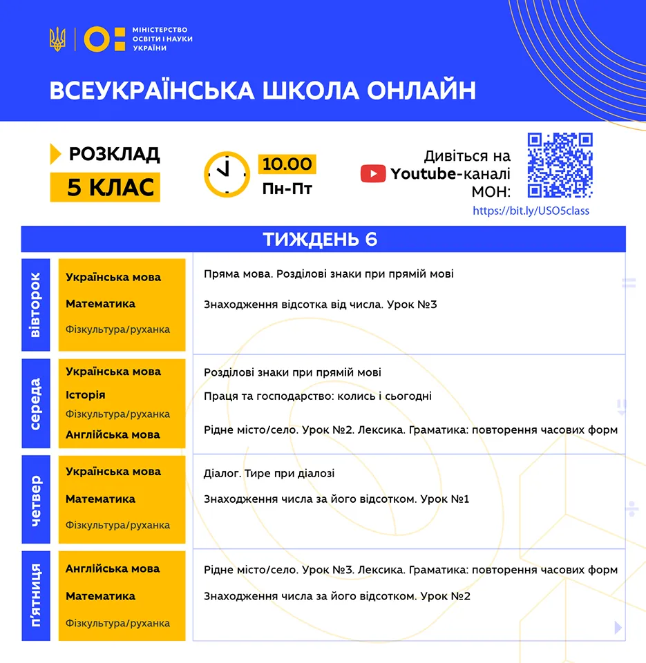Розклад для 5 класу / інфографіка: МОН