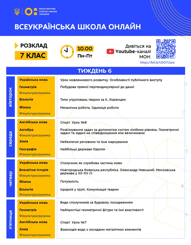 Розклад для 7 класу / інфографіка: МОН