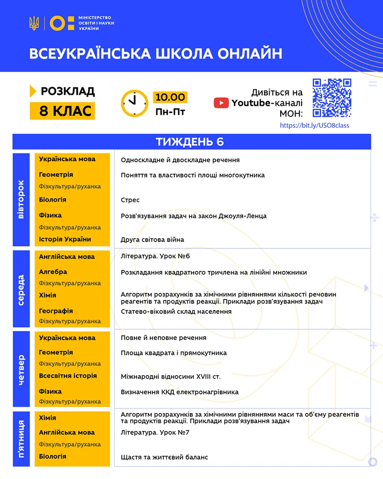 Розклад для 8 класу / інфографіка: МОН