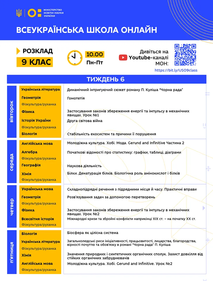 Розклад для 9 класу / інфографіка: МОН