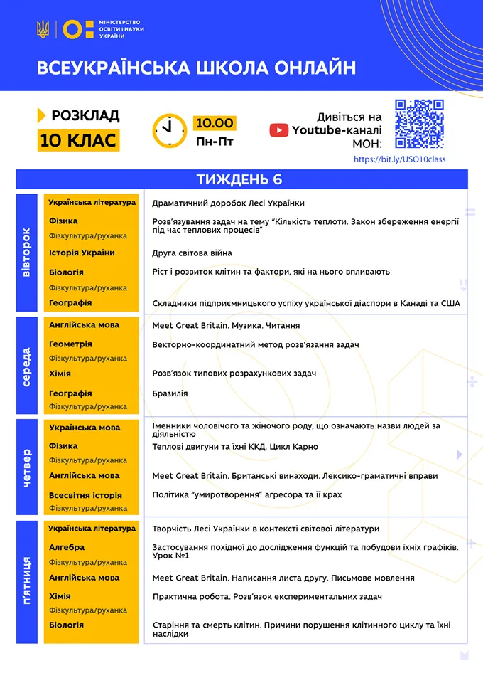 Розклад для 10 класу / інфографіка: МОН