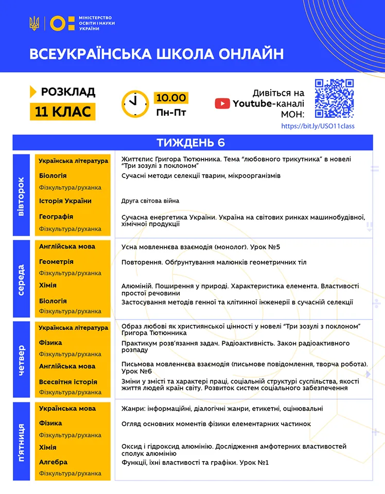 Розклад для 11 класу / інфографіка: МОН