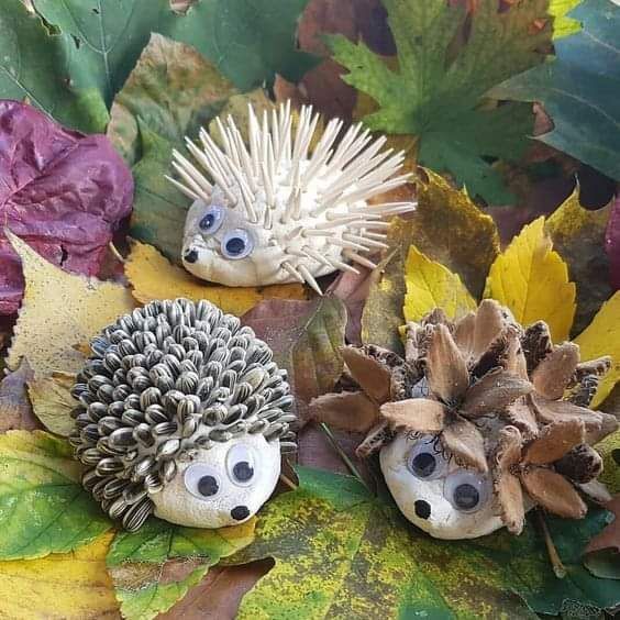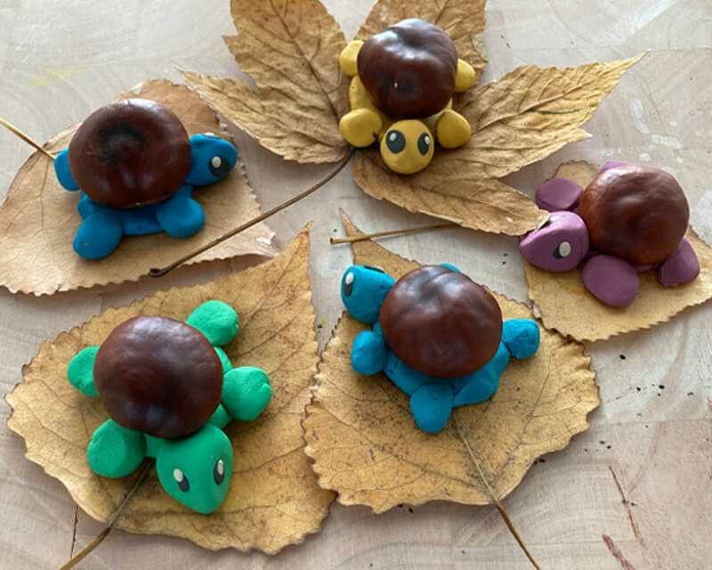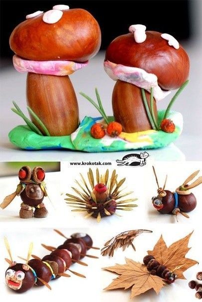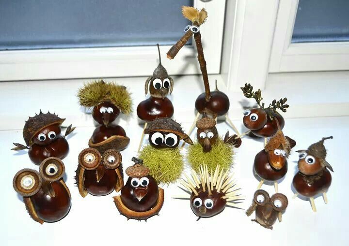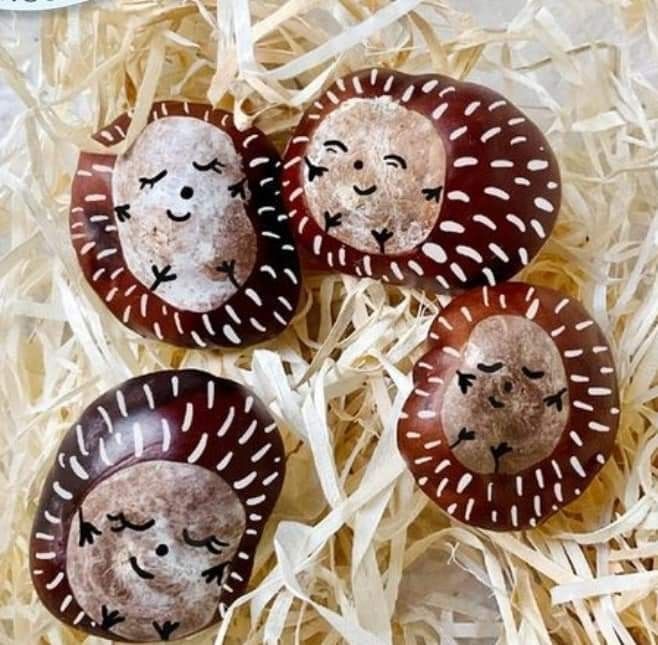 З каштанів можна зробити равликів, мурашок, павуків, чоловічків, тваринок. Розмалювати каштани чи скласти з них об'ємні вироби. І чи не найпопулярнішим сюжетом є їжаки.