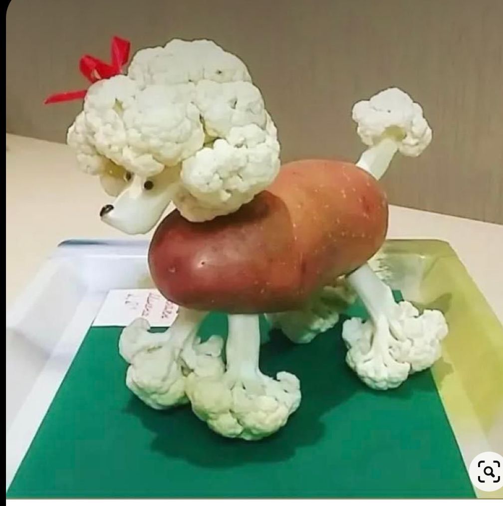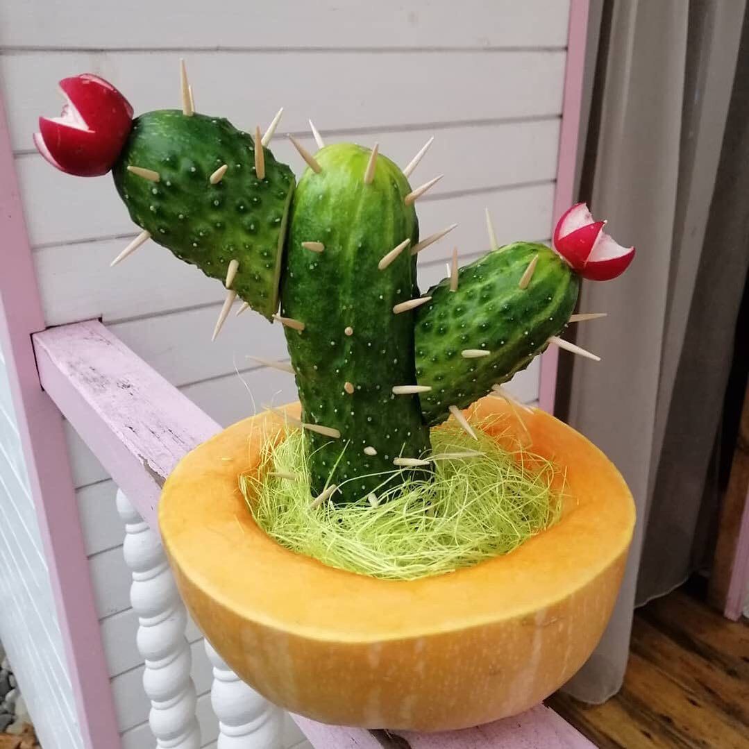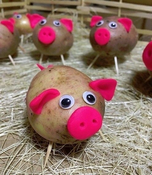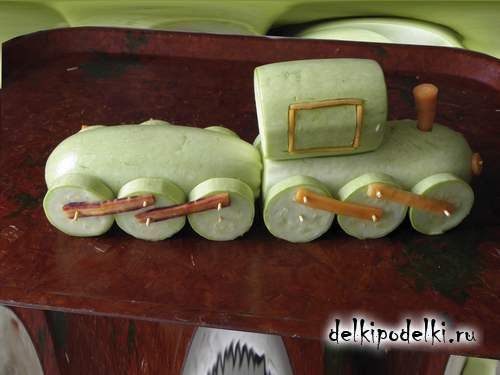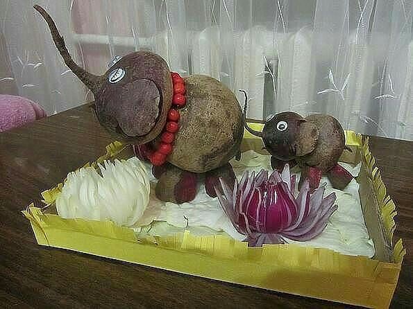 З яблук можна виготовити розкішну гусеницю, морквини стануть жирафами, качан цвітної капусти стане пуделем чи кудлатою овечкою. А кілька картоплин – веселою сімейкою поросят. Столовий буряк з довгим хвостиком – слоненям. Огірки стануть кактусом, крокодилом чи автівкою.