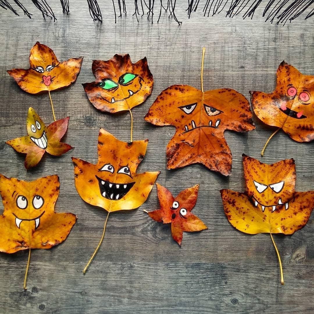 Чи навіть на листках намалювати цікаві мармизи і розповісти – кого хотіли створити автори поробки, чи одразу задати тему – казкові герої, монстри, друзі чи рідні, тварини. Фантазією дітей ви точно будете здивовані – від вибору листочка, асоціації і до намальованого обличчя.