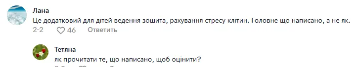 "Почерки у дітей бувають нерозбірливі і потрібно над ними працювати. Зате вони друкують прямо – 21 століття, все ж. І навіщо оцінювати зошит, треба знання оцінювати"