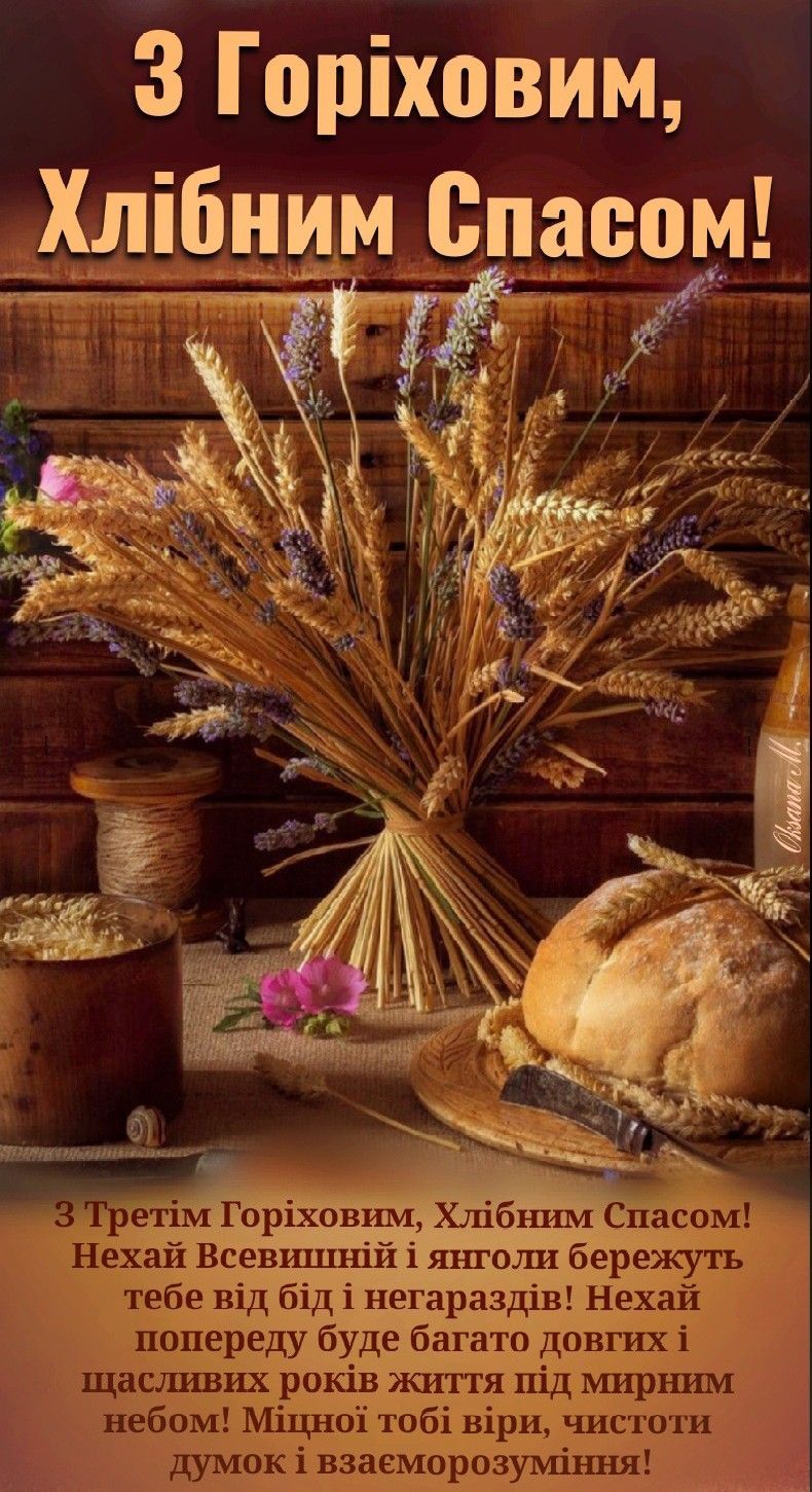 З Горіховим та Хлібним Спасом! Нехай достаток входить в дім, щоб був хліб і до хліба в нім! І жилося вам у Мирі всім на радість! Здоров'я! Миру! Достатку!