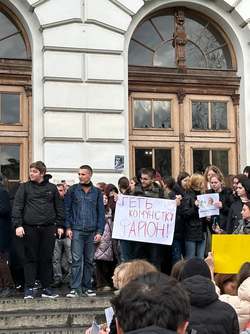 Збиратись студенти розпочали близько 12:00 години біля головного корпусу "Львівської політехніки". Багато з учасників мітингу принесли з собою плакати "Фаріон – геть", "Ірина Фаріон ганьбить Україну", "Геть комуністку Фаріон". Про те, що відбувається під стінами вишу – розповідає 24 Канал.