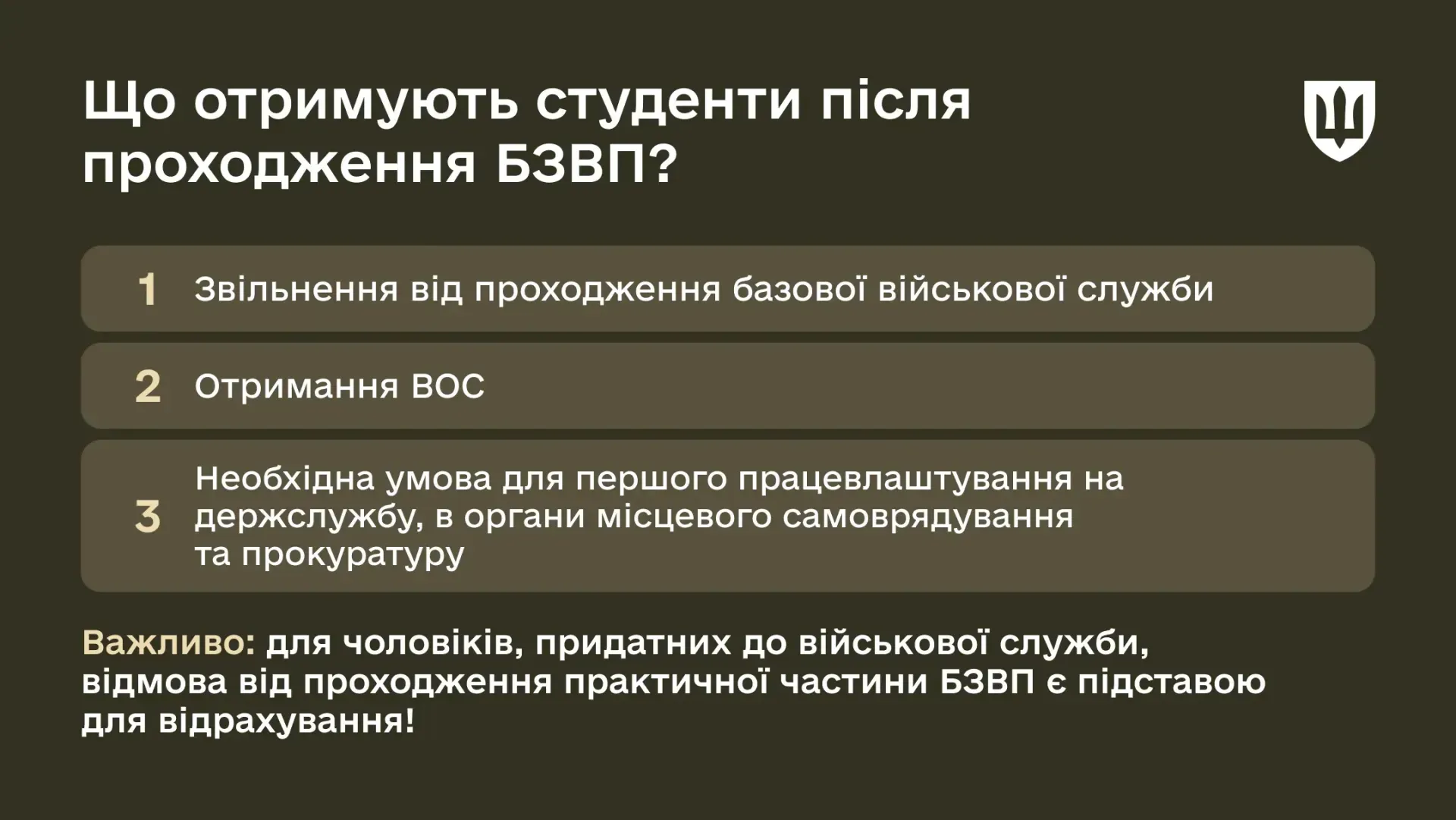 После прохождения БЗВП студенты принимают военную присягу и получат сертификат и военно-учетную специальность. Это освободит их от прохождения обязательной базовой военной службы, которую, согласно действующему законодательству, должны пройти все мужчины в возрасте 18 – 25 лет.