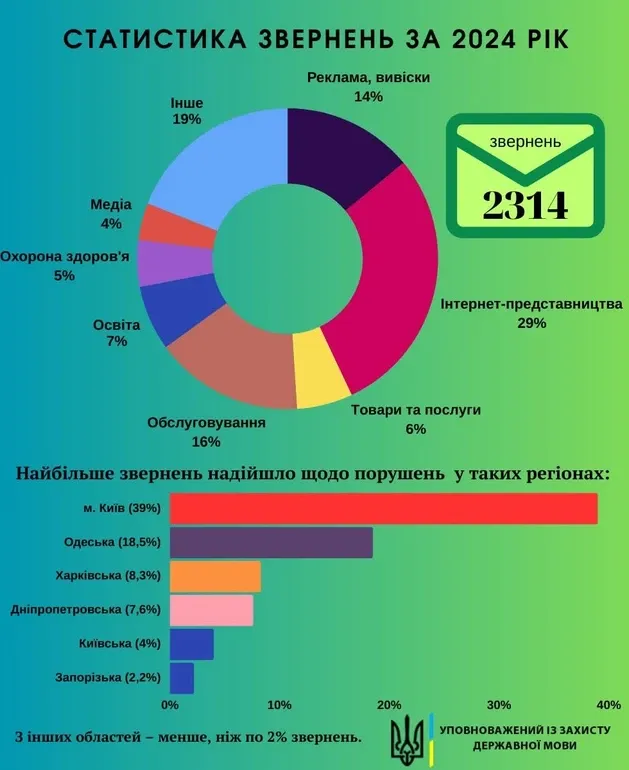 Также в 2024 году омбудсмен получил 72 обращения (3%) о нарушении языкового закона должностными лицами местного самоуправления, в частности депутатами местных советов. Жалобы касались несоблюдения языкового законодательства в официальном общении, а также публичных выступлений или комментариев для медиа.