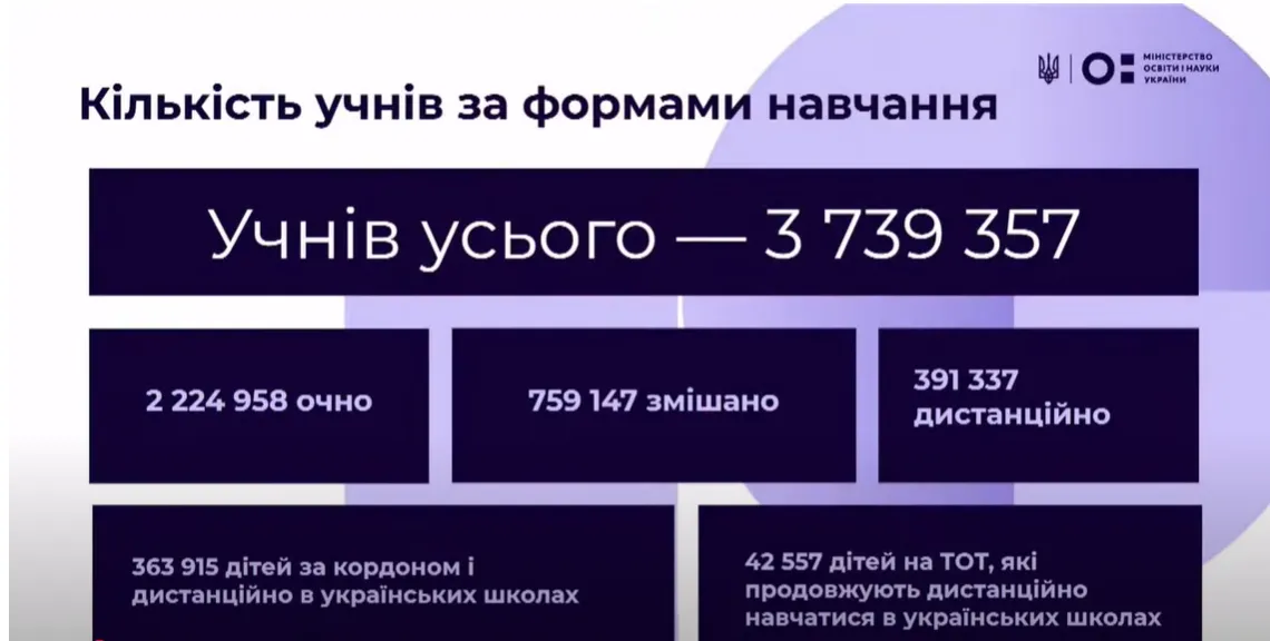 При этом 363 915 учеников получают образование за рубежом и дистанционно в украинских школах. А 42 557 детей на ВОТ продолжают дистанционно учиться в украинских школах.