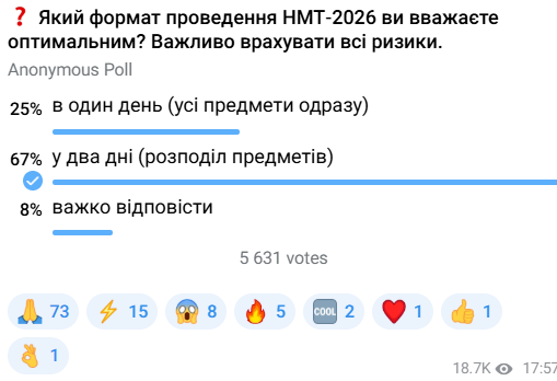 Большинство присутствующих поддерживало проведение тестирования в один день. Опрос, который объявил в телеграме, говорит об обратном,