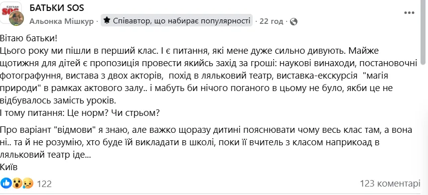 Есть вопросы, которые меня очень сильно удивляют. Почти каждую неделю для детей есть предложение провести какое-то мероприятие за деньги: научные изобретения, постановочные фотографирования, спектакль из двух актеров, поход в кукольный театр, выставка-экскурсия "магия природы" в пределах актового зала... И ничего плохого в этом не было, если бы это не происходило вместо уроков,