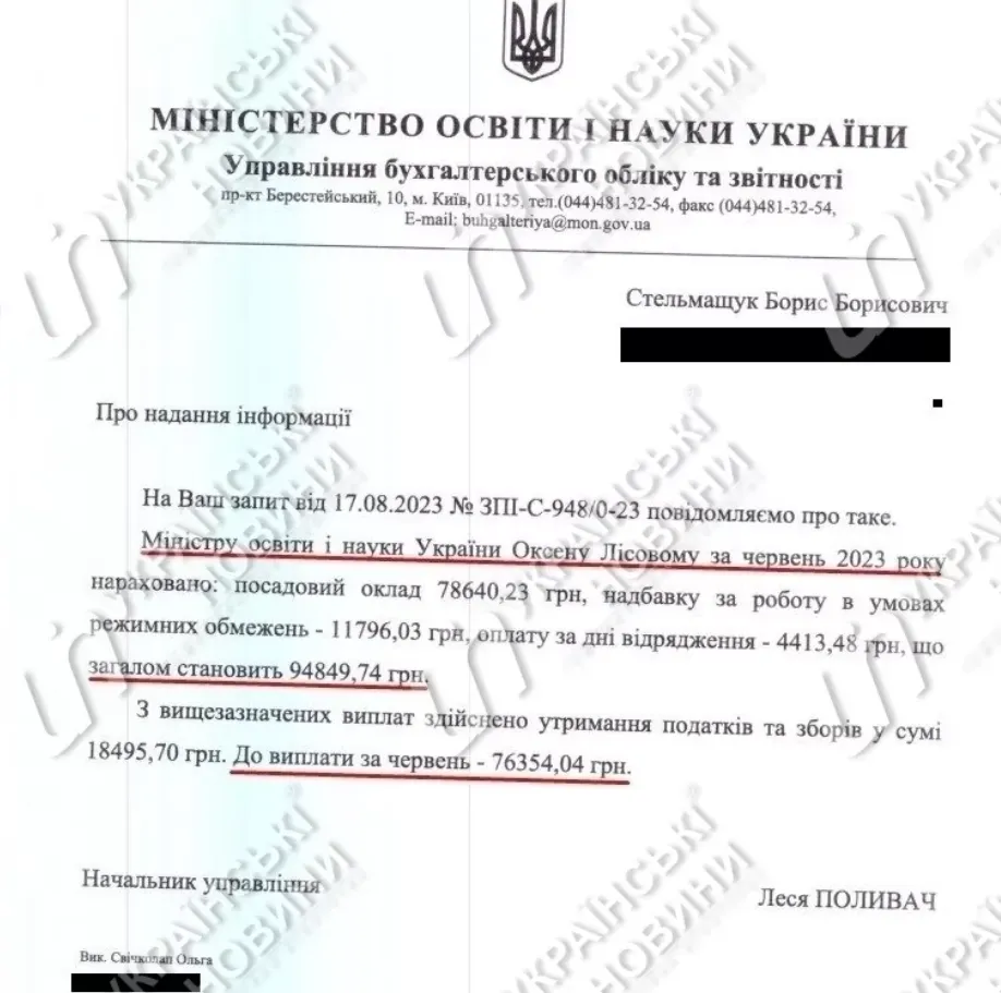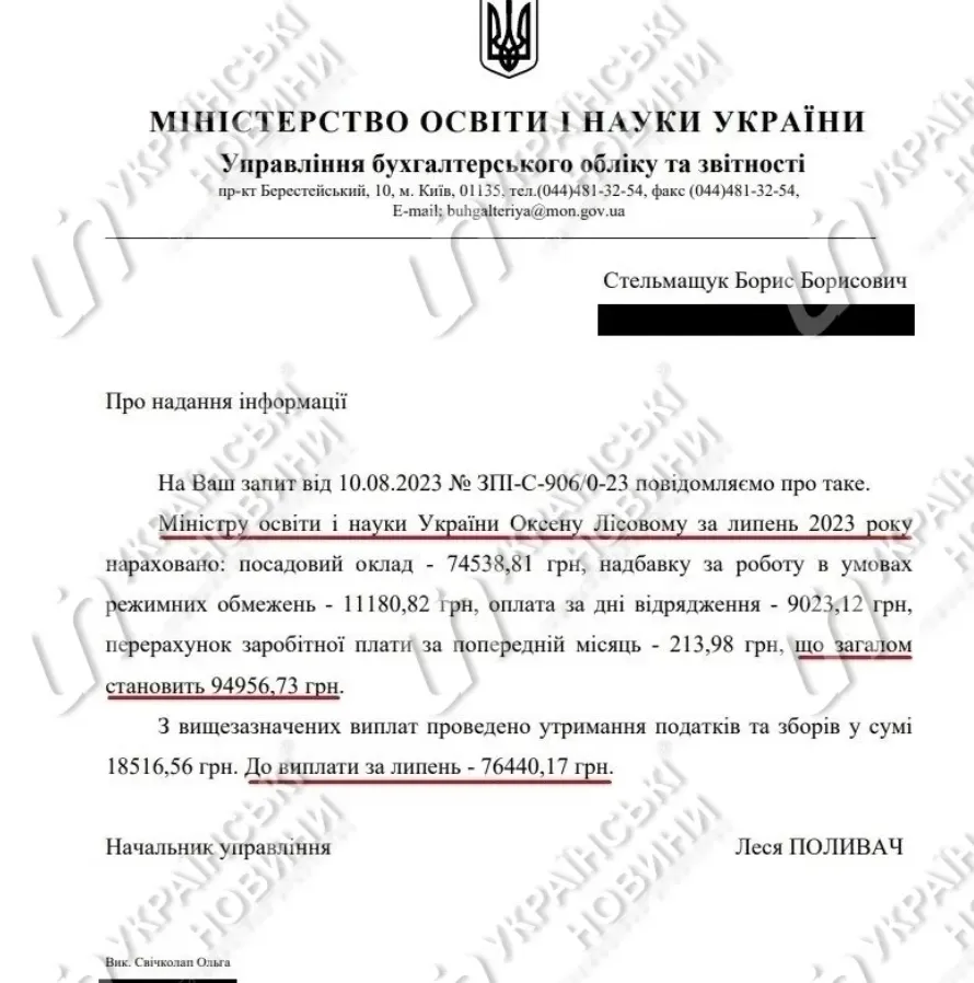 В общем – 94 850 гривен. Налоги и сборы составили 18496 гривен. К выплате за июнь министр получил 76 354 гривен, уточнили в МОН.