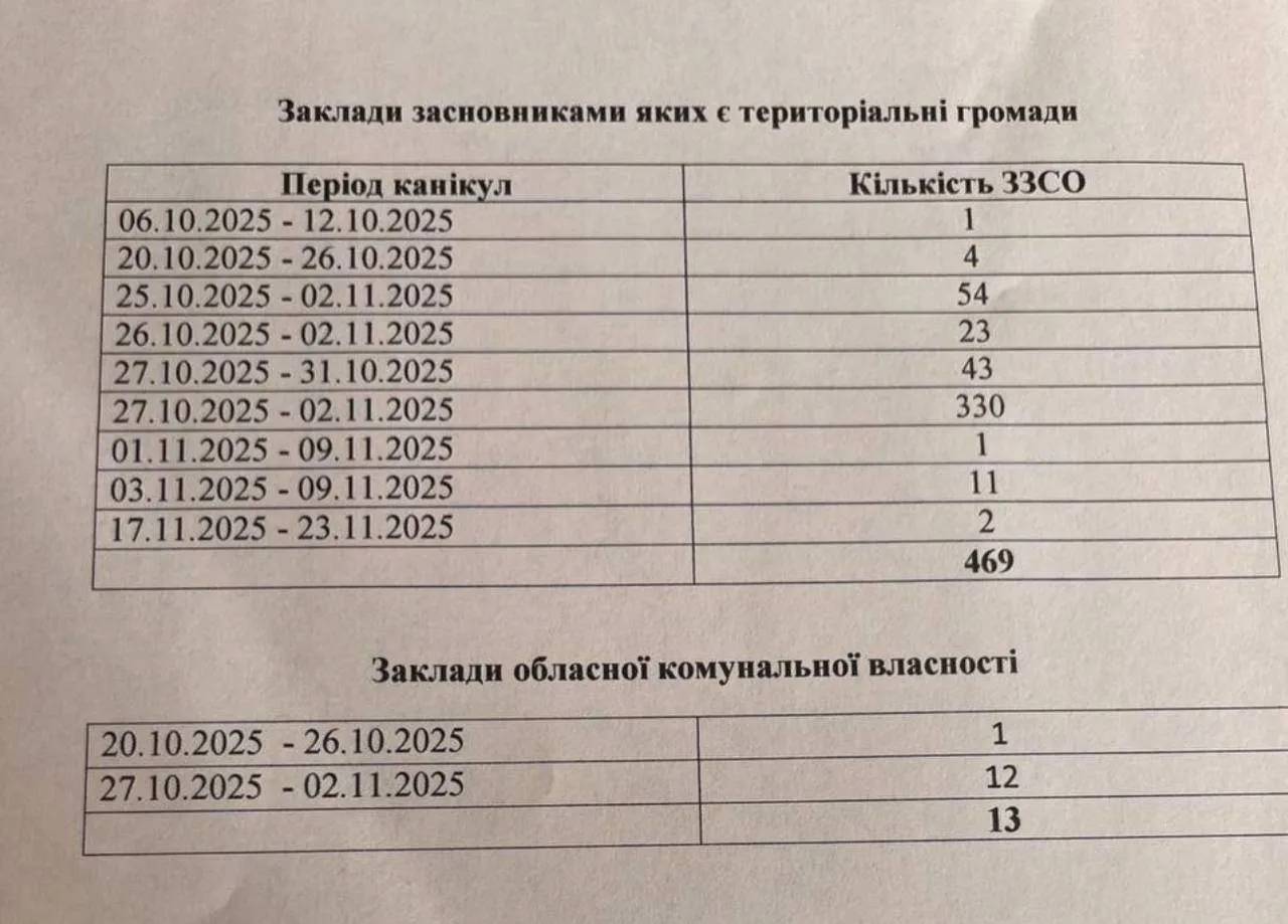 В то же время, по данным департамента образования и науки Хмельницкой ОВА, в некоторых школах области осенние каникулы начнутся только 17 ноября.