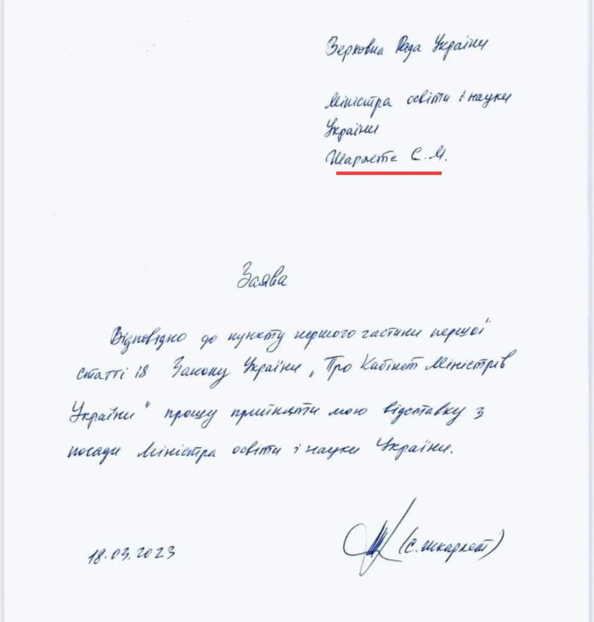 Вместо министра образования и науки "Шкарлета" чиновник написал "Шарлете". Фото заявления обнародовали в сети.