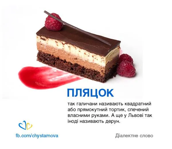 Пляцком на Западе Украины называют особую сладкую выпечку. Этот десерт похож на торт, только прямоугольной формы. Его подают нарезанным квадратиками. Пляцок привлекателен не извне, как торт, а именно в середине – многоярусный, цветной, с разнообразным наполнением. Галицкие хозяйки пляцки выпекают на свадьбу и различные религиозные праздники.