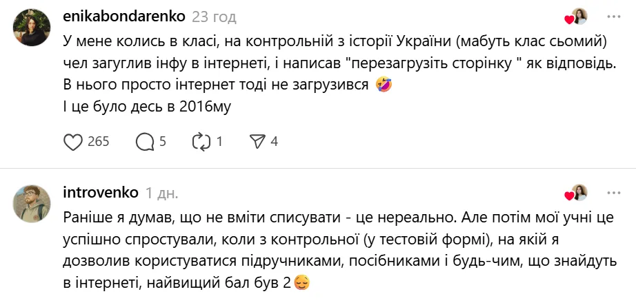 Пост вызвал ряд комментариев, от педагогов, которые делились примерами неудачного списывания из своего опыта. Другие корреспонденты вспоминали, как сами списывали будучи учениками или студентами и как на такие случаи реагировали педагоги.