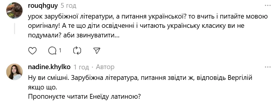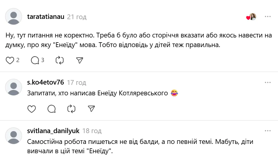 Не обошлось и без хейта – что, мол, учительница неправильно сформулировала вопрос, не научила детей предмету, поэтому они не знают элементарного ответа. Ну и конечно, что нынешнее образование и учителя не учат детей, а так – отбывают день на работе. Поэтому дети не умеют мыслить, выстраивать логическую связь и им неинтересно учиться. О том, что контрольные, тем более на уроках зарубежной, вообще не нужны, потому что никто того помнить не будет и в жизни оно не понадобится.