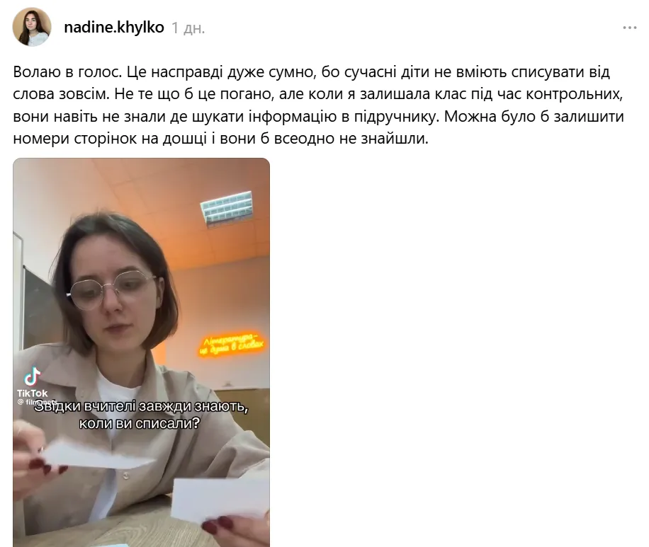 Это показало видео, которое опубликовала учительница Алина Мец в своем тиктоке, рассказывает 24 Канал. На чем она подловила своих учеников и какую дискуссию тема списывания вызвала в сети – читайте дальше.