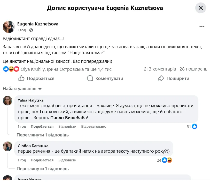 Автором нынешнего текста Радиодиктанта под названием "Надо жить!" стала писательница Евгения Кузнецова. Однако не обошлось без шквала критики в ее адрес и чтеца текста Натальи Сумской, отмечает 24 Канал.