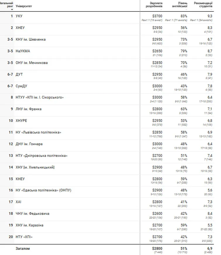 Киевский политехнический институт имени Сикорского, который является крупнейшим ИТ-университетом Украины, занял 8-е место рейтинга. Несмотря на высокие зарплаты, студенты и выпускники КПИ скептически отзываются о своем вузе.