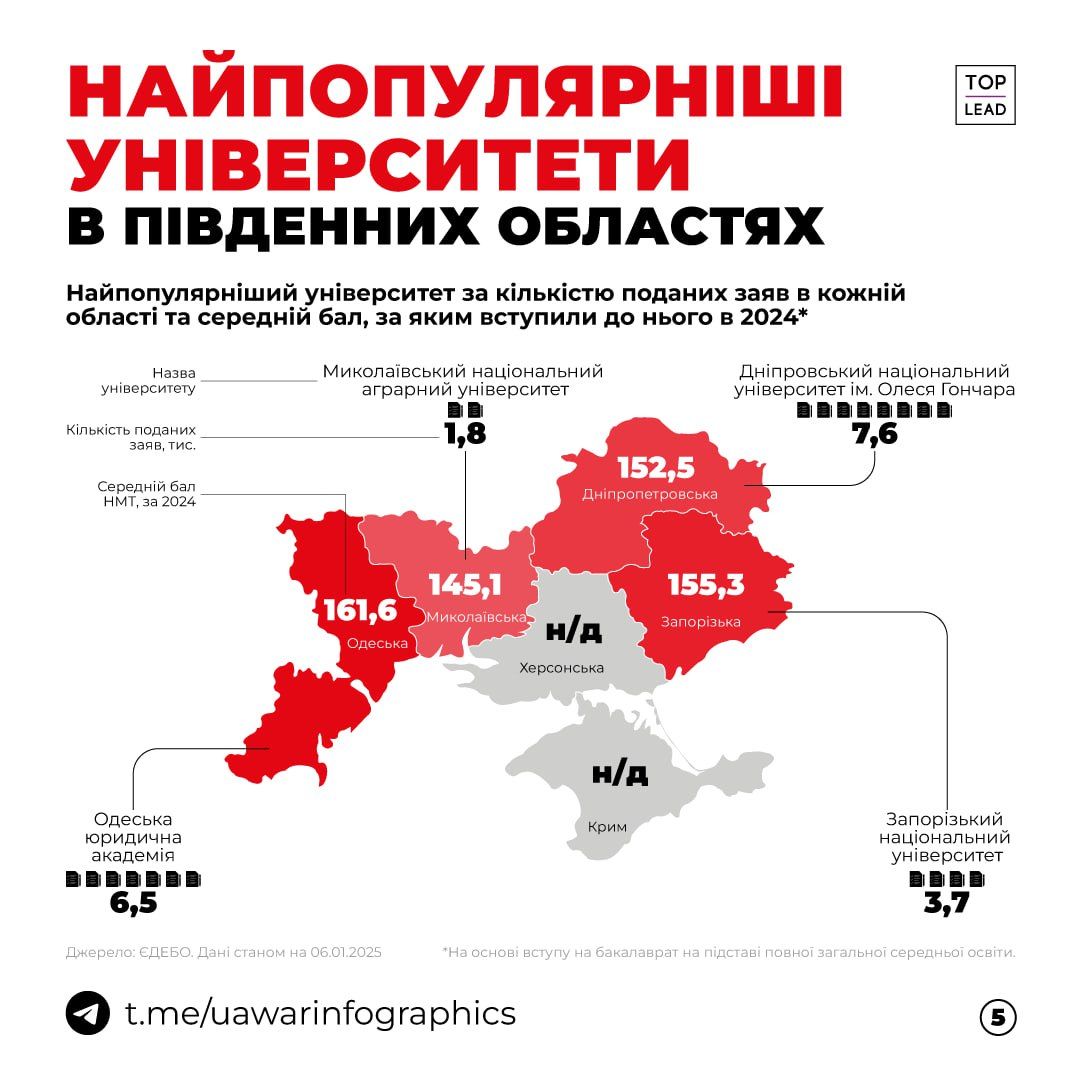 В южных областях самым популярным оказался Донецкий национальный университет имени Олеся Гончара – 7,6 тысячи поступающих с 152,5 средними баллами. "Серебро" получила Одесская юридическая академия – 6,5 тысячи абитуриентов с 161,6 балла. Третий – Запорожский национальный университет – 3,7 тысячи будущих студентов с 155,3 балла.