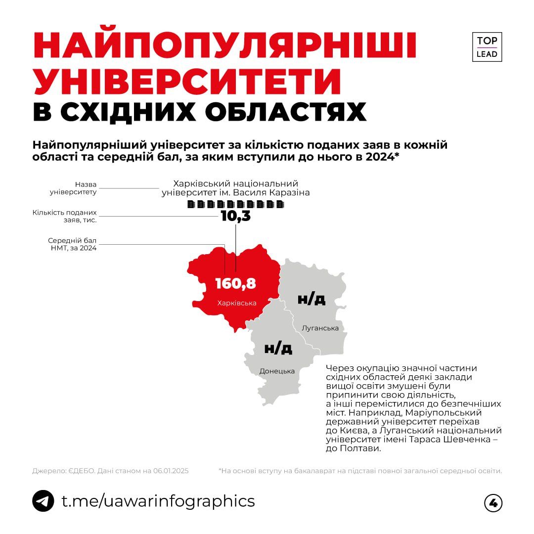 Самым популярным вузом, который выбирали поступающие северных областей Украины в 2024 году, стал Киевский национальный университет имени Тараса Шевченко. Сюда подали заявления 29,5 тысячи абитуриентов.