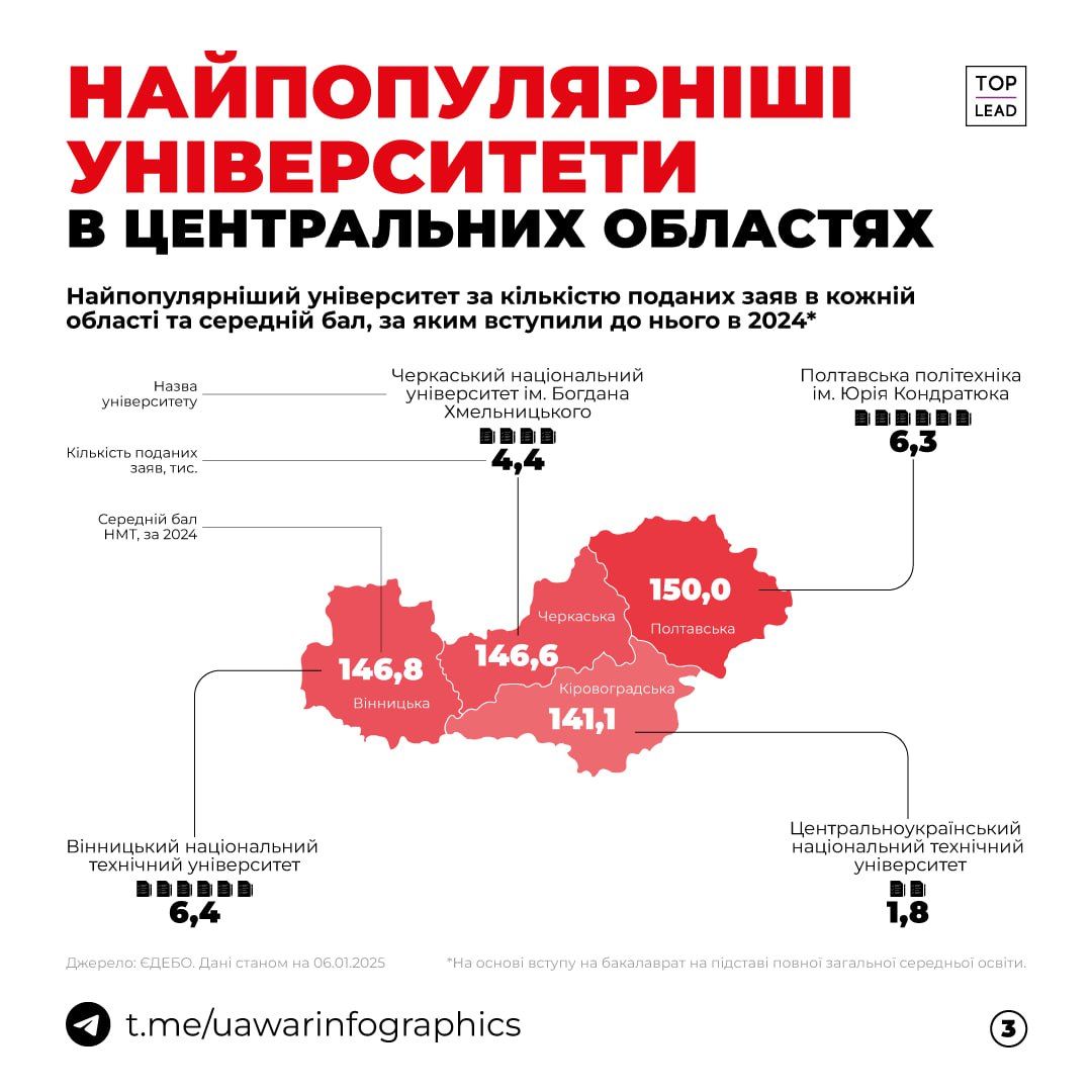В центральных областях нашего государства самым популярным стал Винницкий национальный технический университет. Туда подали заявления 6,4 тысячи поступающих со средним баллом НМТ 146,8. Вторая – Полтавская политехника имени Юрия Кондратюка: 6,3 тысячи заявлений со средним баллом 150. Черкасский национальный университет имени Богдана Хмельницкого получил 4,4 тысячи заявлений абитуриентов (средний балл – 146,6).
