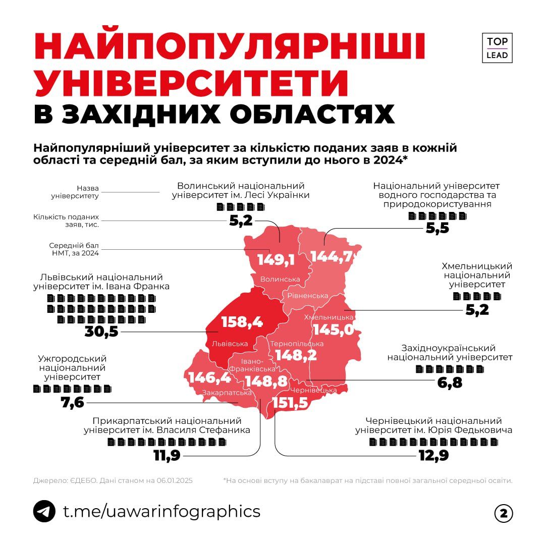 На западе Украины лидер – Львовский национальный университет имени Ивана Франко. Его выбрали 30,5 тысяч поступающих со средним баллом НМТ 158,4. Второе место получил Черновицкий национальный университет имени Юрия Федьковича. Сюда поступило 12,9 тысячи заявлений от абитуриентов со средним баллом 151,5. Третий – Прикарпатский национальный университет имени Василия Стефаника – 11,9 тысячи будущих студентов с 148,8 (средний балл).