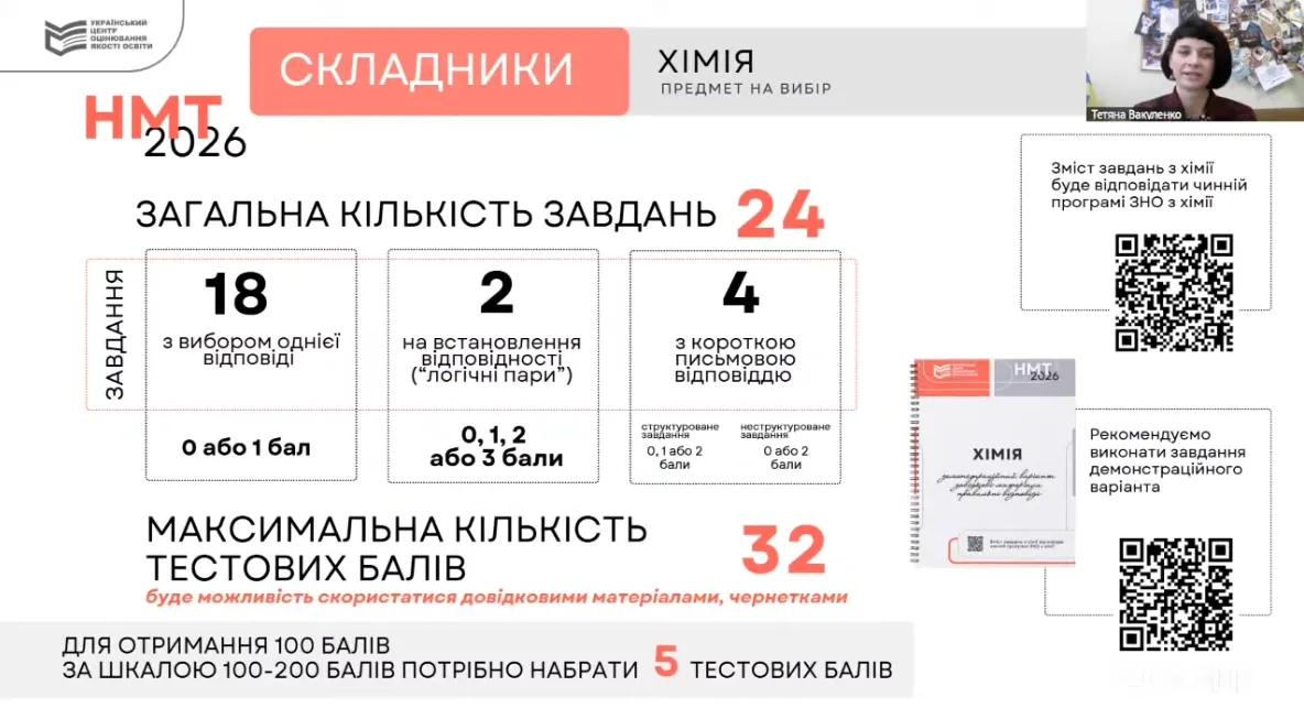 Важно! Татьяна Вакуленко уточнила, что все демонстрационные задания и справочные материалы по химии или физике можно найти, если перейти по QR-кодам, которые были размещены во время вебинара (смотрите на скриншотах из видео выше). Они ведут на сайт УЦОКО.