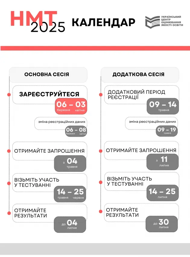 На сдачу НМТ-2025 предусмотрели 4 часа, которые разделены на два блока. Первые два часа выделяют на тесты по украинскому языку и математике. Затем будет перерыв на 20 минут. А следующие два часа – работа с заданиями по истории Украины и предмета по выбору.