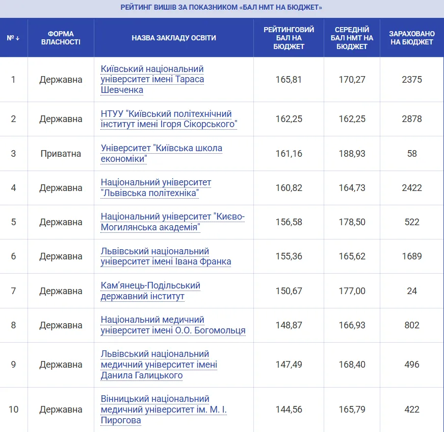 Этот рейтинг содержит информацию о среднем балле НМТ абитуриентов, которых зачислили на обучение за средства государственного или местного бюджета на первый курс для получения степени бакалавра (магистра медицинского, фармацевтического или ветеринарного направлений).