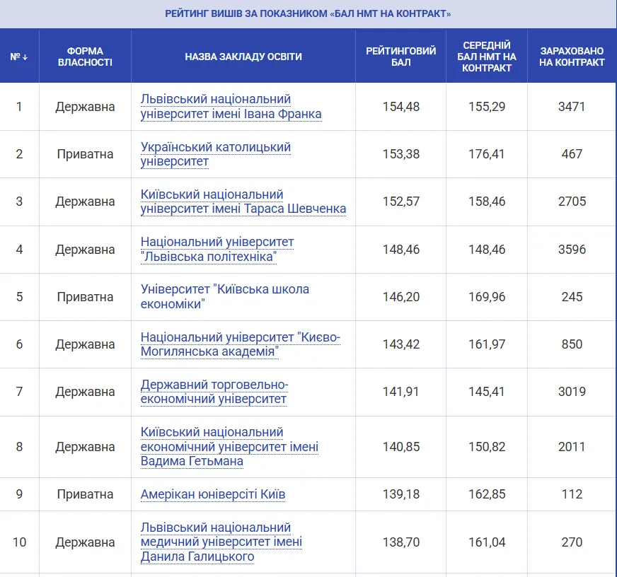 Предлагаемый рейтинг де-факто определяет лидеров среди высших учебных заведений Украины, в которых абитуриенты с самыми высокими баллами НМТ изъявили желание получать высшее образование за собственные средства.