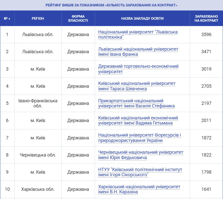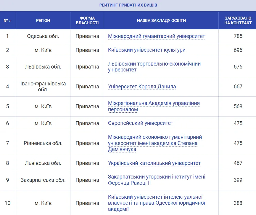 Статистические данные рейтинга разделили по нескольким группам, отмечает 24 Канал. Он содержит информацию о среднем балле НМТ поступающих, количество зачисленных лиц на бюджет и на контракт, конкурс на одно бюджетное место, количество лиц, зачисленных в частные вузы, а также другие данные.