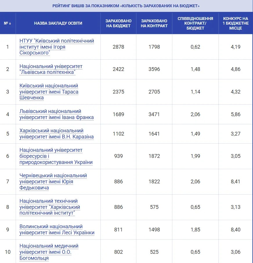 Этот рейтинг определяет лидеров среди украинских ЗВО, что зачислили на обучение больше всего абитуриентов за средства физических и юридических лиц на первый курс для получения степени бакалавра (магистра медицинского, фармацевтического или ветеринарного направлений).