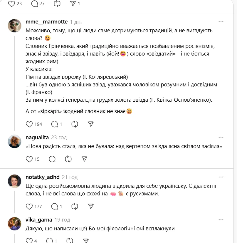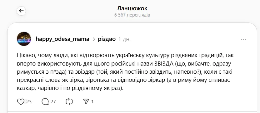 Пользовательница соцсети решила спросить у других: "Почему люди, которые воспроизводят украинскую культуру рождественских традиций, так упорно используют для этого русские названия "ЗВІЗДА" и "звіздяр", когда есть такие прекрасные слова как "зірка", "зіронька" и "зіркар". При этом она заявила, что эти слова ей рифмуются с матом.