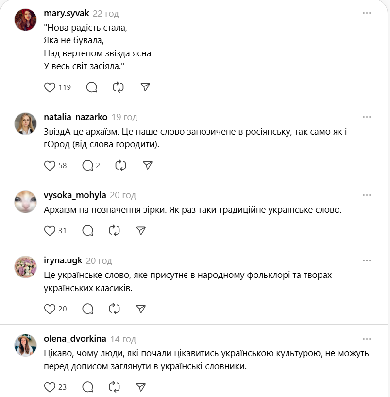Что интересно, есть украинцы, которые считают, что слово "звізда" является не украинским, а русским. Об этом информирует 24 Канал со ссылкой на сообщение в Threads пользовательницы с псевдонимом happy_odesa_mama.
