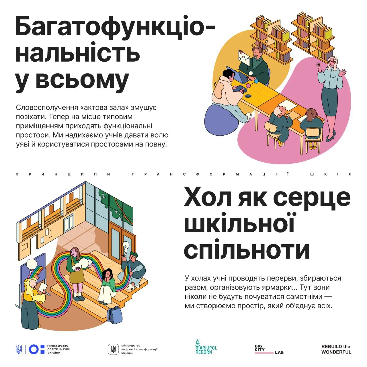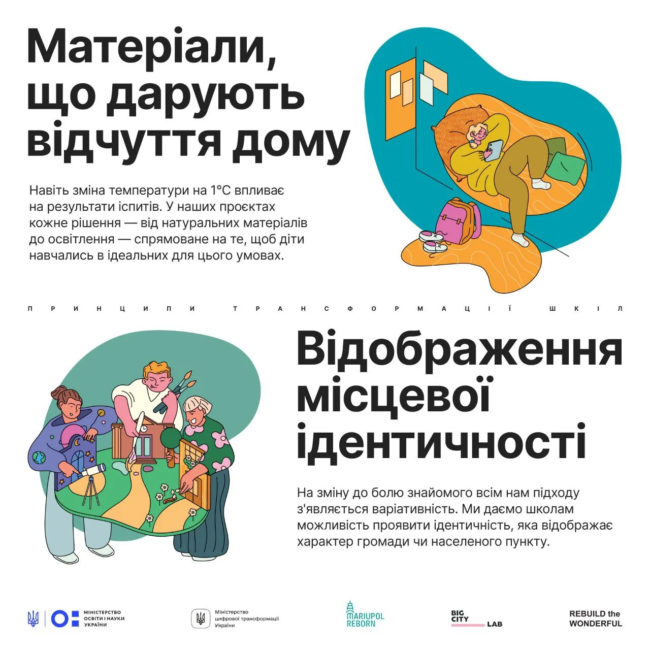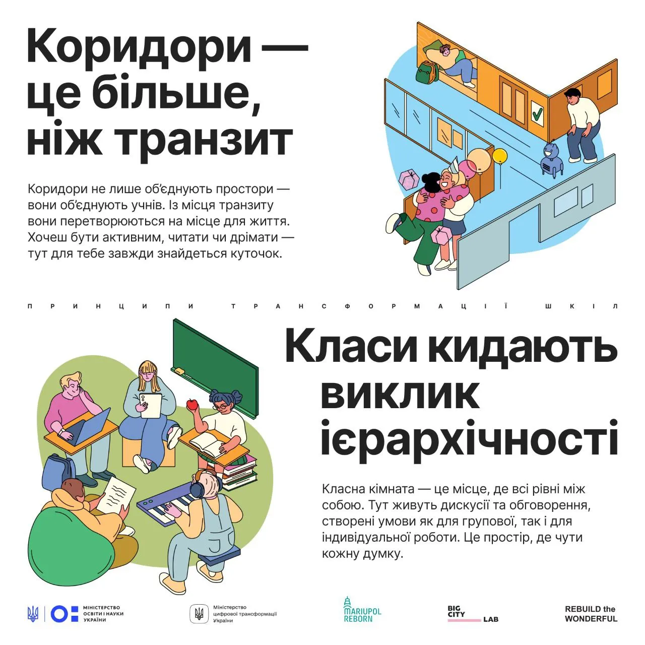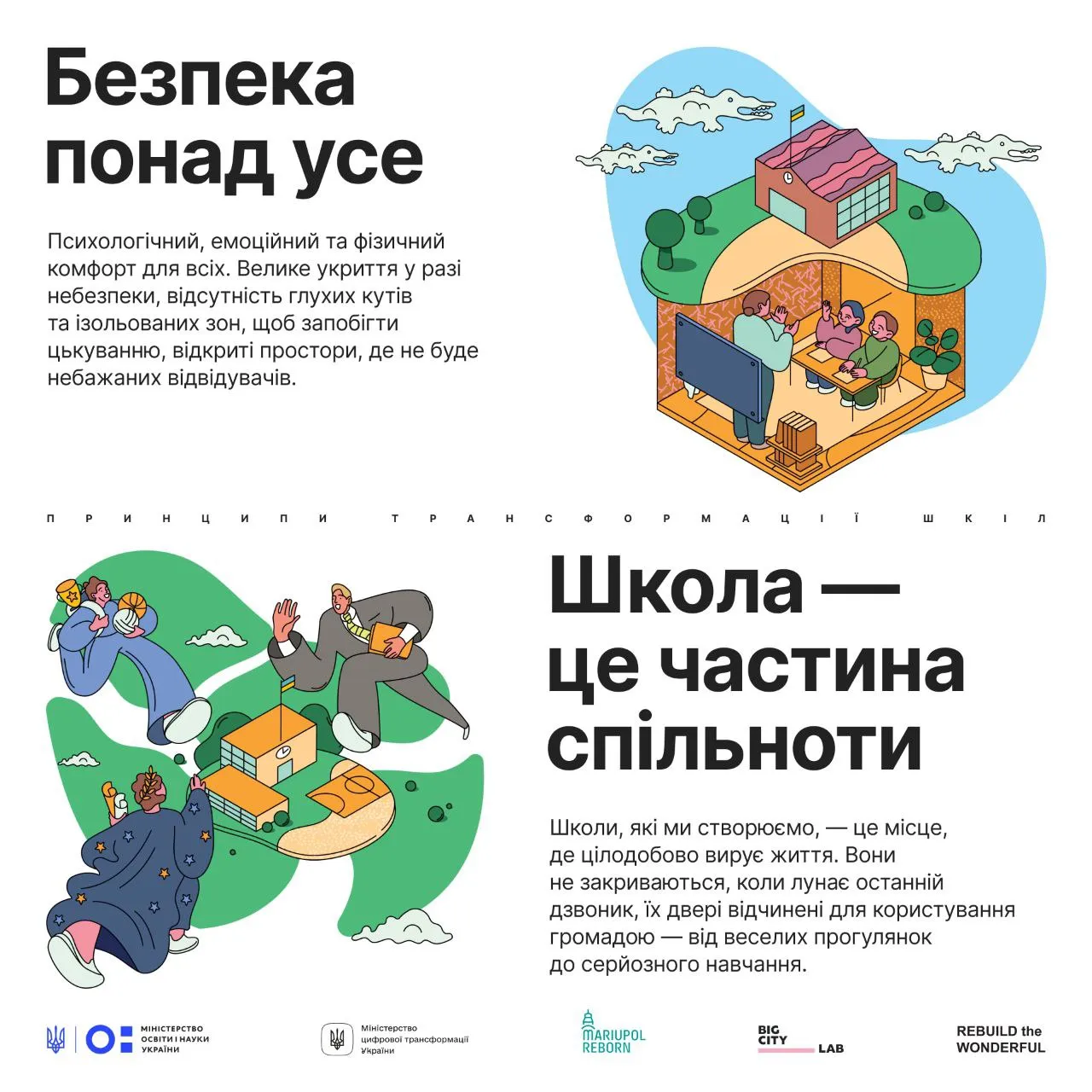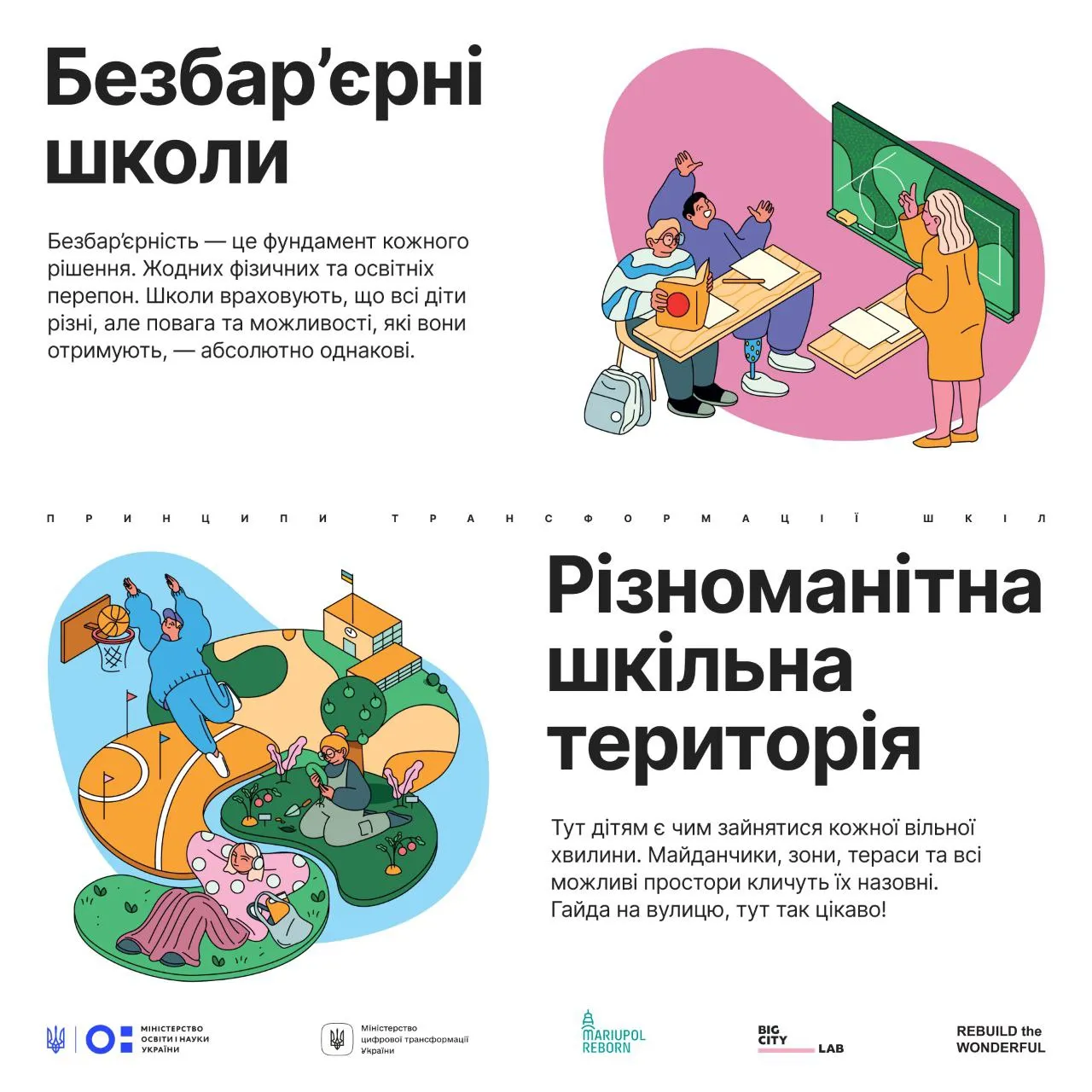 Щоб зробити простори шкіл такими, що надихають, та вплинути на розвиток майбутніх поколінь, команда трансформації розробила 12 принципів відбудови шкіл.