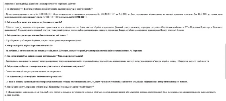 В Укрпошті нажали відповідь щодо втрати документів / скриншот відповіді