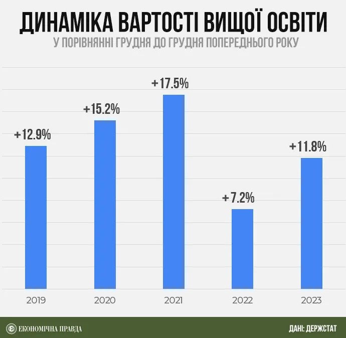 Студент, який вступив до університету у 2019 році, платив за річний контракт 25 тисяч гривень. У 2020 році вартість зросла на понад 15% – до 28,8 тисячі гривень. З урахуванням щорічного здорожчання контракту у 2023 році навчання коштувало б 40,5 тисячі гривень.