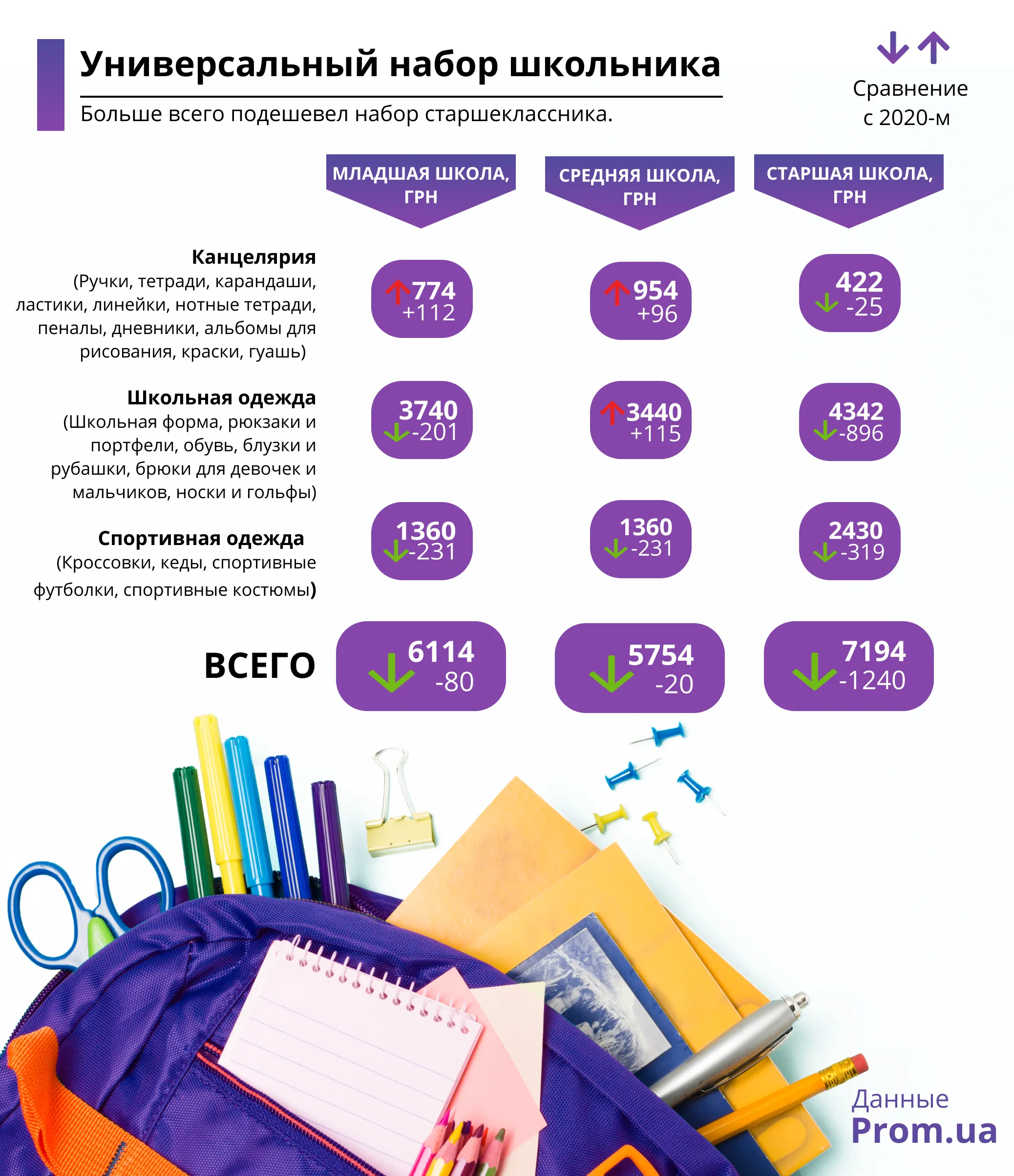 Спортивний костюм обійдеться в 480 гривень, а кросівки або кеди – в 440 гривень. На канцтовари витрачають більше всіх – 954 гривн, що на 180 гривень більше ніж канцтовари для першокласника, і на 532 більше – ніж для старшокласника.